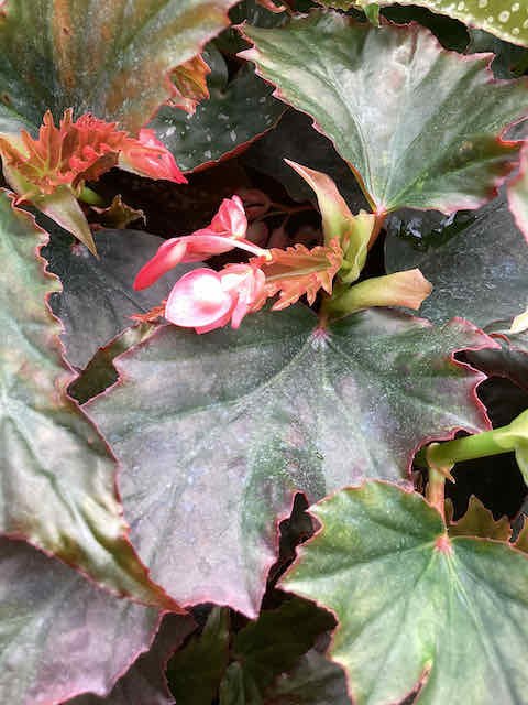 Begonia Edith Rose is a lovely free branching cane or 'Angel Wing' type. It has medium dark olive leaves with a red tinge. It has dark rose flowers with some fragrance.