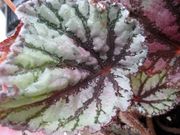 Rex begonia of large size with large leaves of silver, pink, and emerald green. It makes a large adult plant of graceful appearance.