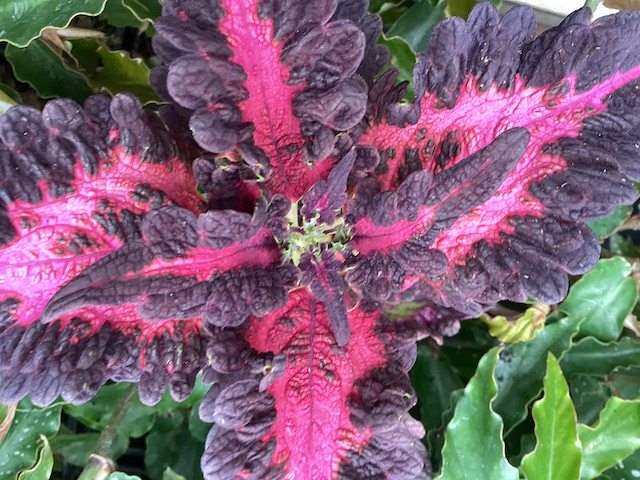 Coleus Ruby Laser has a vibrant hot pink centers with a deep purple ruffled edge to its leaves. Very pretty, definitely stands out and is quite eye catching. Can be grown indoors or outdoors and is hardy to zone 11.